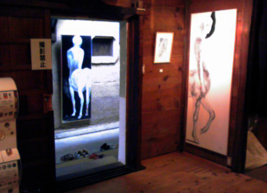 蔵内から出る瞬間、通路の作品と蔵内の作品を同時に楽しめます。