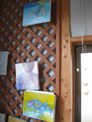 ラティス(それも一番安い薄いタイプ)をタテにして壁から吊り下げ、キャンバスを引っ掛ける金具をクロスする部分につけて小品を乾燥させています。