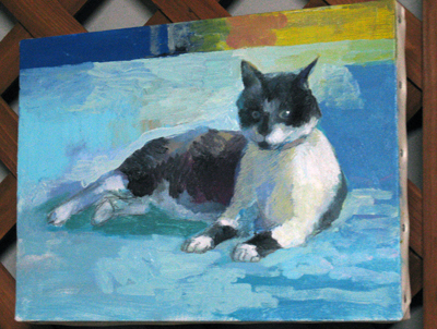 できるだけ説明的にならないように、水色の背景と白黒猫の色の対比を前面に押し出して仕上げたいところです。