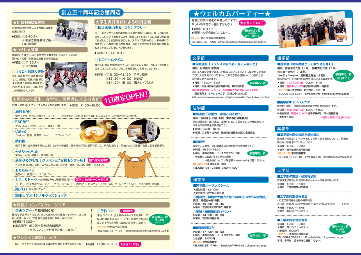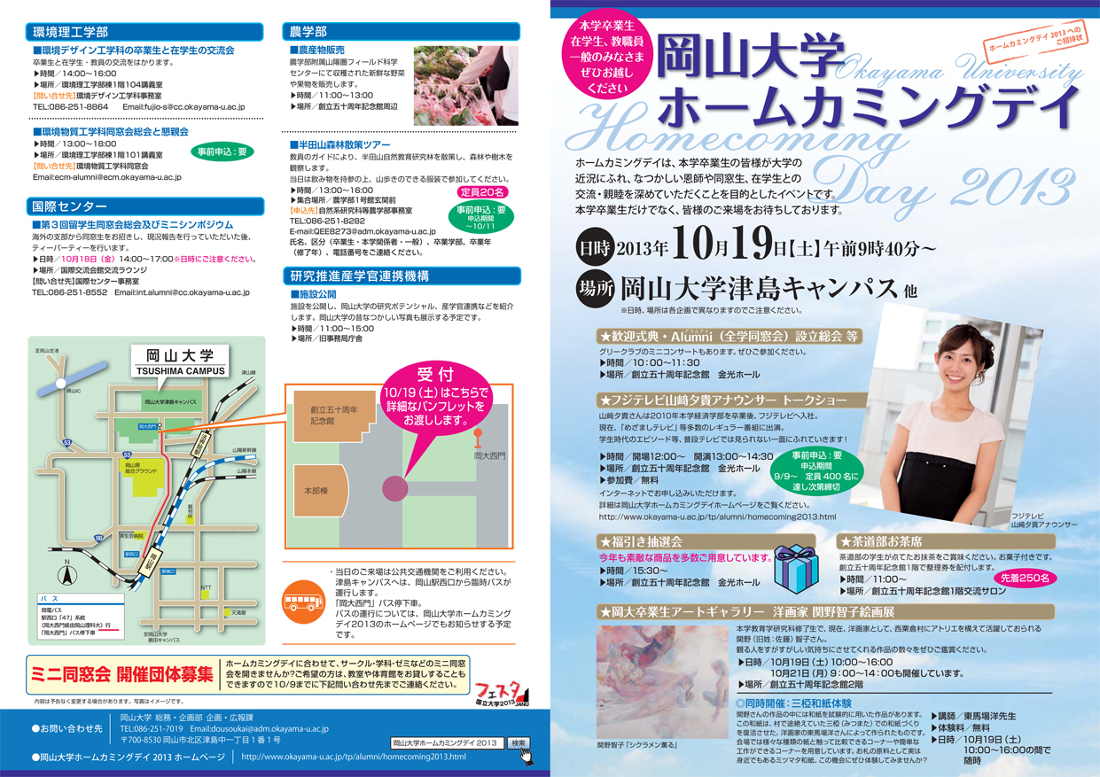 岡山大学ホームカミングデイのご案内 イベント 2013年09月01日 岡山大学ホームカミングデイが10月19日に開催されます。 絵画展のみ19日(土)&21日(月)の開催です(時間など詳細はフライヤーをご参照ください) 絵画展のフライヤーももう少ししたら完成します。 恩師をはじめ、多くの方に助けていただいて進んでおります。 あとは作品を揃えるだけ。がんばります。