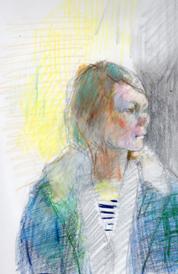 冬の色 制作 2013年11月19日 今日はモデルさんがいらしてくださいました。 光が入る縁側に座っていただき、肌の中にいろんな色を探してスケッチをしました。 ジャケットをもっと暗い青緑にして、 左半分の背景の色も同系色でまとめてみようかなと思っています。 しっとりとした油彩画になればいいのですが。
