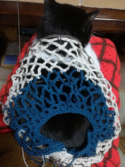 膝の猫の体をすっぽり包める所まで編めました。