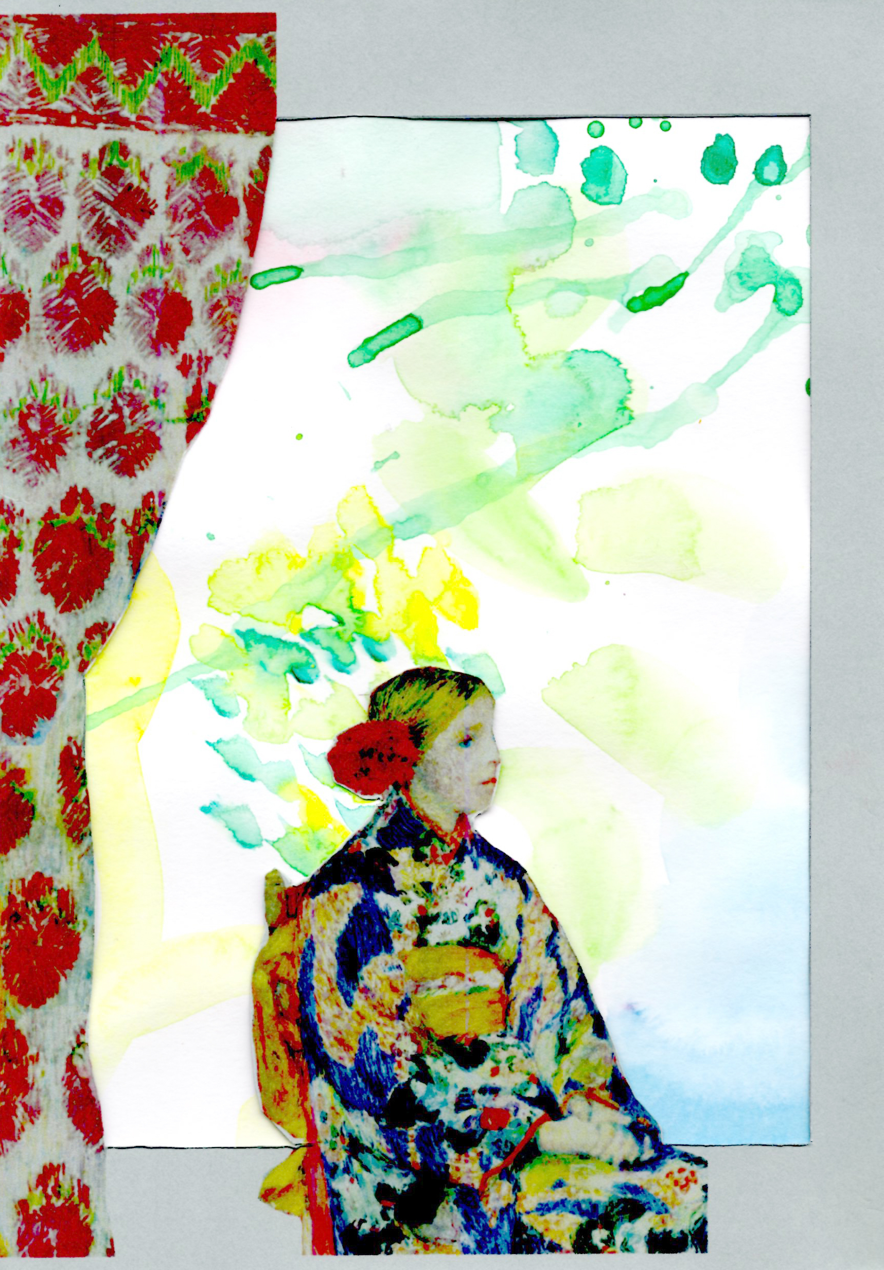 偶然できた模様に窓枠に見立てたフレームとコラージュ素材を組み合わせたもの。