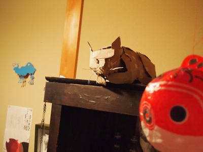 雑ですが 制作 2012年11月08日 昨夜、冷蔵庫の上の猫が岩石のように丸い塊にみえたので、 風呂上りに衝動的にダンボールで作ってみました。 上:冷蔵庫の上の猫。写真だと頭ばかりおおきくて体が華奢にみえますが、肉眼だとモリモリの体に見えたのです。 中:ダンボールでつくった雑猫をとりあえず座敷机の上にのせてみた。 下:タンスの上に置き、ちょっとムードのある感じにしてみた。 すごく雑だけど、小一時間集中して作りました。あー面白かった。 思いつきで猫の顔を作った後に体をつけていきました。 顔だけ特に凹凸が無いのが残念。