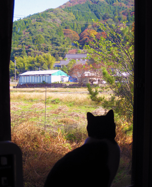 窓の外 徒然 2013年11月08日 スチール棚が並んでいた奥の部屋を、静物画を描くための部屋として使用。 そのため、夏からずっと、パソコンのそばの窓は奥の部屋から出された棚で塞がれていて、 とても息苦しい感じが。 数ヶ月制作をしてみて、棚が元の場所に戻っても制作には支障がないことがわかり、 今朝久々に広々とした景色を眺めながらの仕事。 今年の紅葉は艶やか・・・という訳ではないけれど、それでも光が当たると枯れ草が金色に光って綺麗です。外の景色が観たくて猫も窓辺にやってきたようです。